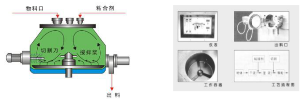 粉體物料與粘合劑在圓筒形容器中由底部混合漿充分混合成濕潤材料,然后由側(cè)置的高速粉碎槳切割成均勻的濕顆粒。制粒時(shí)間短。主藥與輔料差異大時(shí),仍能達(dá)到均勻結(jié)合,無分層現(xiàn)象。